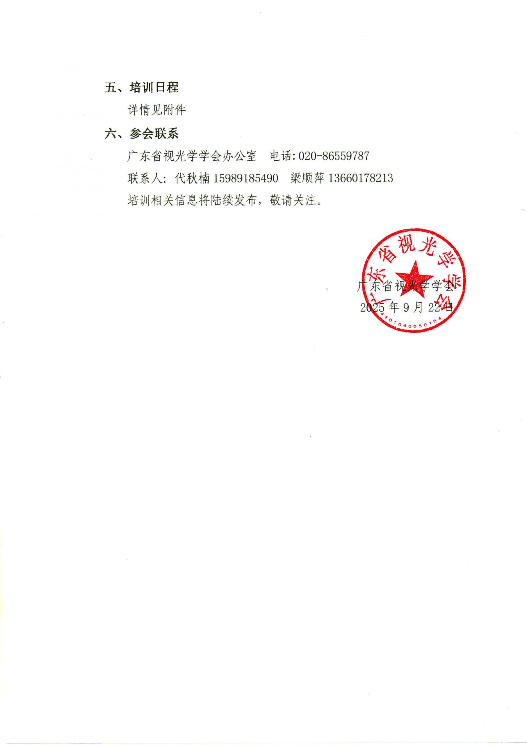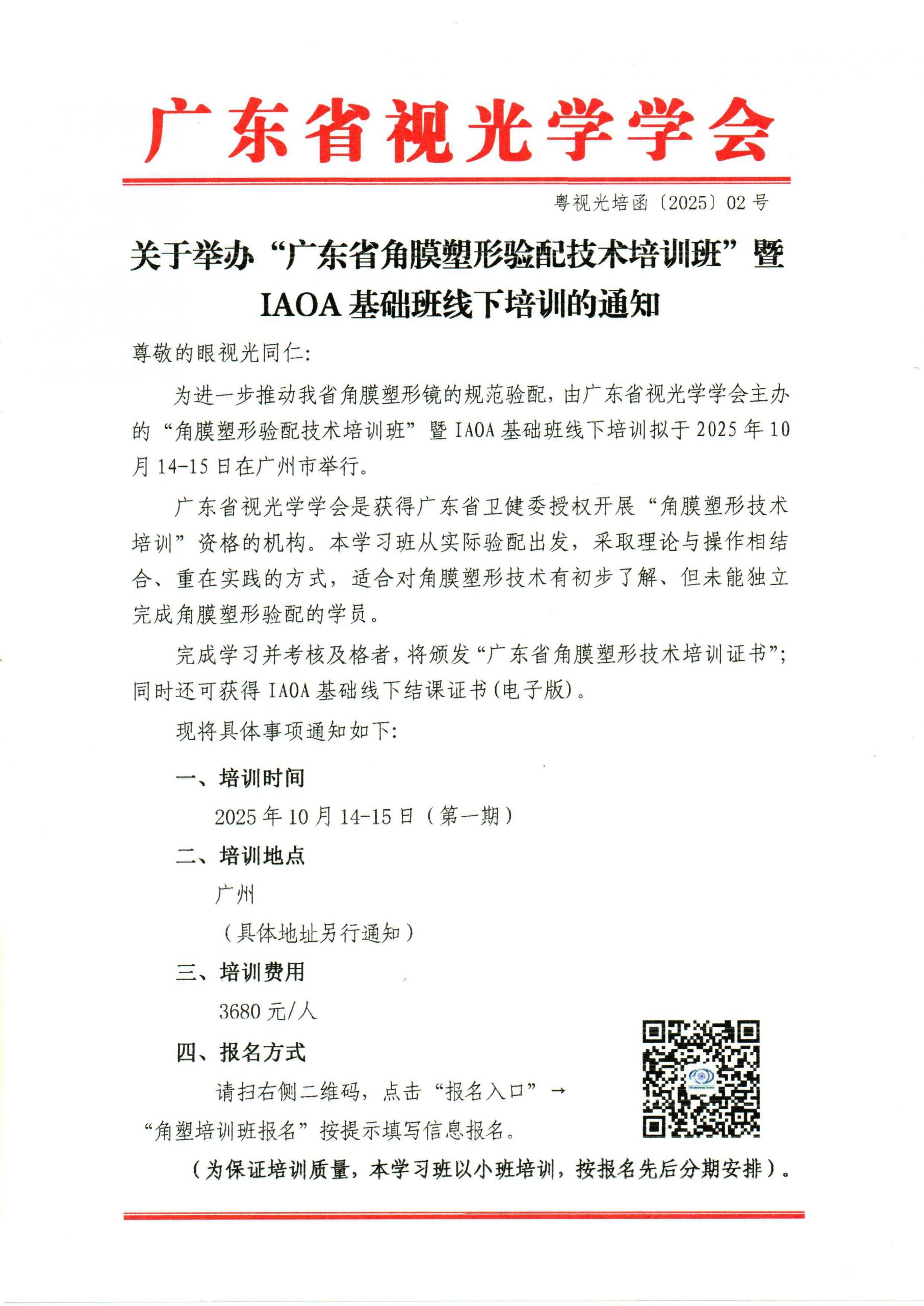 关于举办“广东省角膜塑形验配技术培训班”暨IAOA 基础班线下培训的通知 时间:2025-09-23 分类:通知公告 分享: 上一篇: 关于举办“广东省角膜塑形验配职业技能竞赛” 的通知 相关文章 关于举办“广东省角膜塑形验配职业技能竞赛” 的通知 关于举办“广东省角膜塑形验配技术培训班” 的通知 【培训通知】关于举办“白内障超声乳化手术培训班”的通知 关于推荐广东省视光学学会青年委员会委员的函 【招商函】2025中山眼科斜视与儿童视光论坛 “光明世界,看见未来”——深圳市眼科年会暨2024年度深圳市医学会眼科学分会年会暨2024年度广东省医师协会眼科医师分会眼底病组年会暨2024年度广东省医学会眼科学分会黄斑病学组年会 关于召开第九届“南山眼科论坛”广医附一院“眼科新技术新进展诊疗学习班”暨广东省视光学会屈光白内障手术专委会年会暨广东省眼健康协会防盲治盲专委会换届大会的通知 2024年广东省双眼视觉评估及儿童视觉学习班开班通知