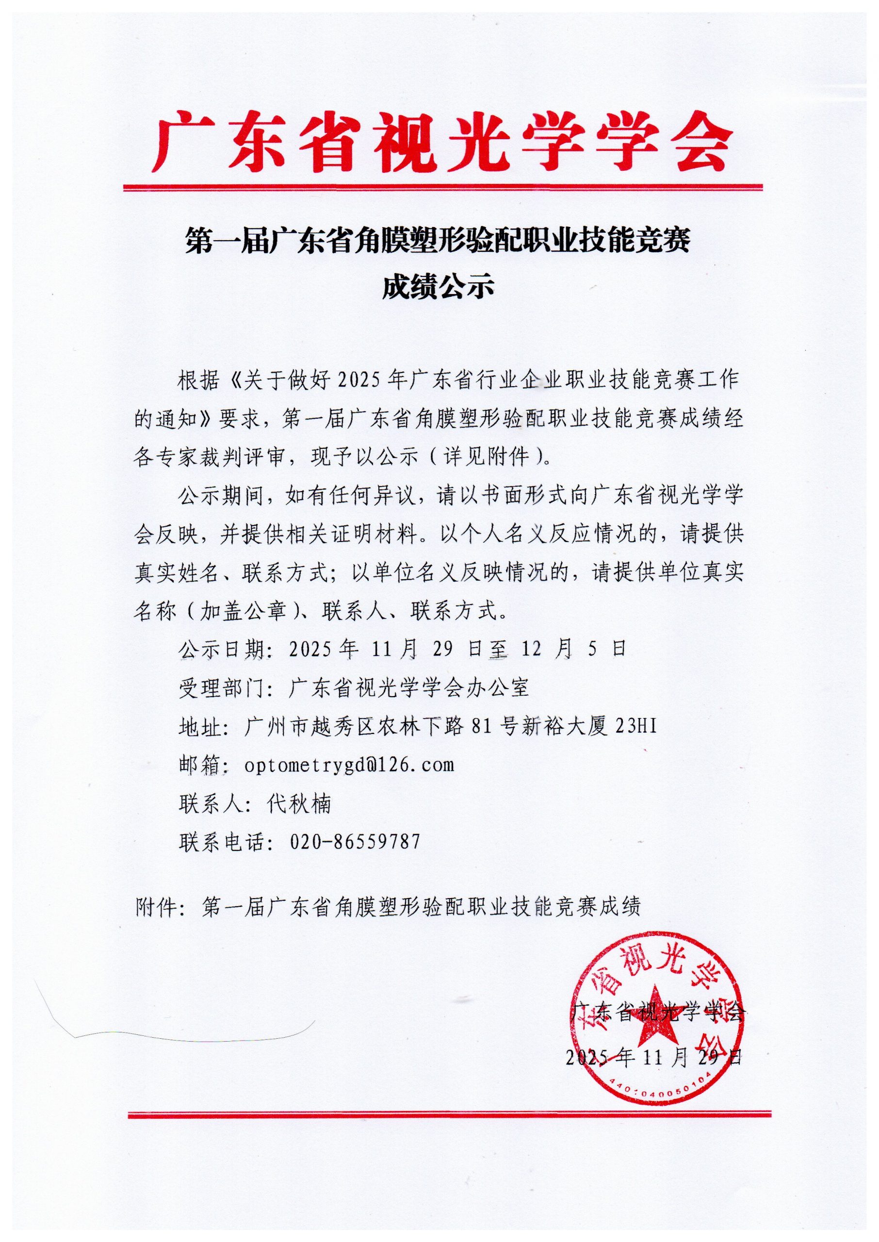 第一届广东省角膜塑形验配职业技能竞赛成绩公示 时间:2025-11-29 分类:通知公告 分享: 上一篇: 关于常态化举办“白内障超声乳化手术培训班”的通知 相关文章 关于常态化举办“白内障超声乳化手术培训班”的通知 关于举办“广东省角膜塑形验配技术培训班”暨IAOA 基础班线下培训的通知 关于举办“广东省角膜塑形验配职业技能竞赛” 的通知 关于举办“广东省角膜塑形验配技术培训班” 的通知 【培训通知】关于举办“白内障超声乳化手术培训班”的通知 关于推荐广东省视光学学会青年委员会委员的函 【招商函】2025中山眼科斜视与儿童视光论坛 “光明世界,看见未来”——深圳市眼科年会暨2024年度深圳市医学会眼科学分会年会暨2024年度广东省医师协会眼科医师分会眼底病组年会暨2024年度广东省医学会眼科学分会黄斑病学组年会